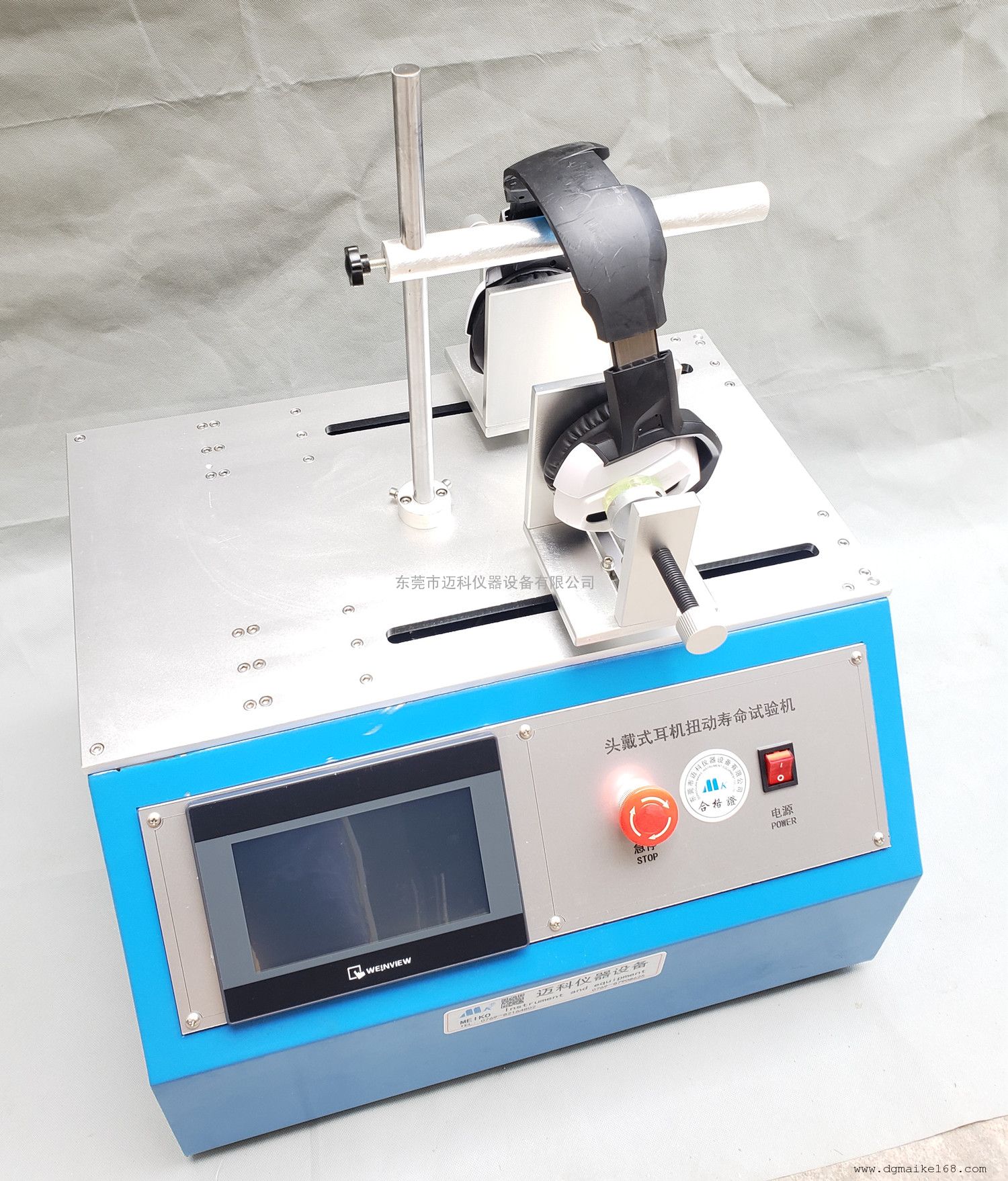 头戴耳机扭动寿命试验机用于头戴耳机产品左右耳罩前后错位耐扭测试。头戴耳机扭动寿命试验机是将产品耳罩两端分别固定在左右夹具上,左右夹具按照一定行程以及相反方向来回往复移动,模拟人使用头戴耳机的扭动测试。