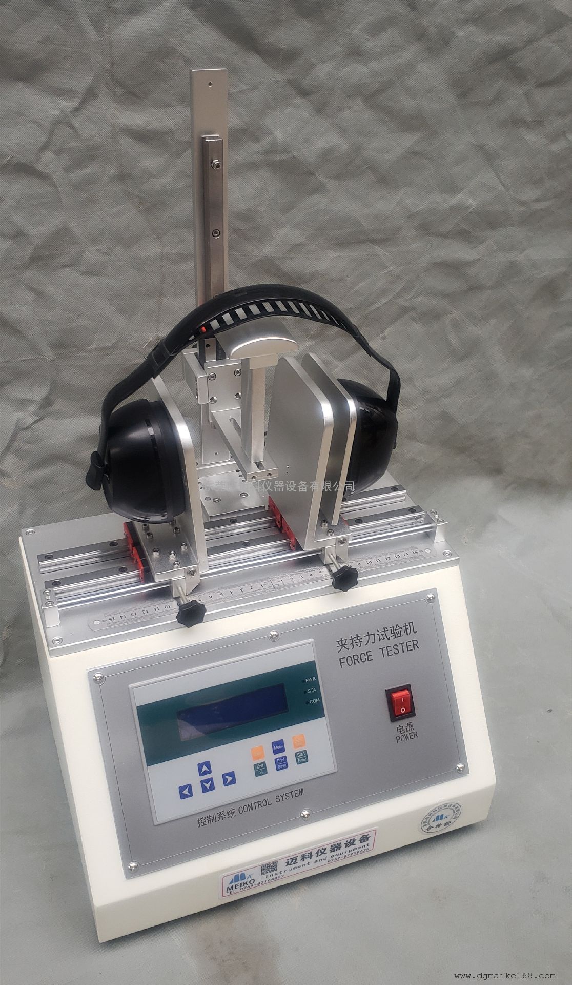 防噪耳机夹持力试验机用于防噪耳机、隔音耳罩等工业头戴耳机夹持力的测试。工业耳机夹持力试验机采用微电脑测控技术,传感器感应力值,液晶屏显示测试数据。