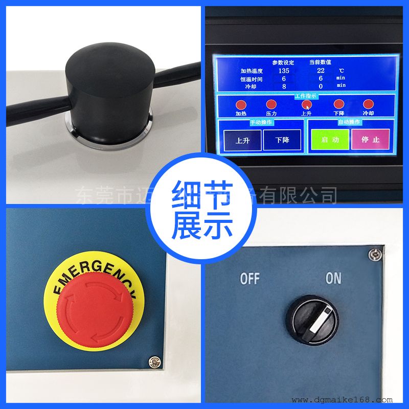 7、操控方式:触摸屏控制系统,加热、压力、上升、下降、冷却提示